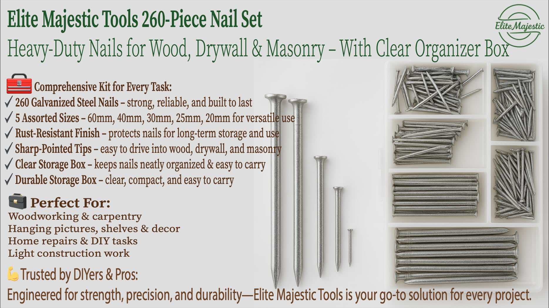 260-Piece Steel Nail Set with Organizer Box ā Heavy-Duty Assorted Panel Pins for Picture Hanging, Wood, Wall & DIY Repairs ā by Elite Majestic Tools
