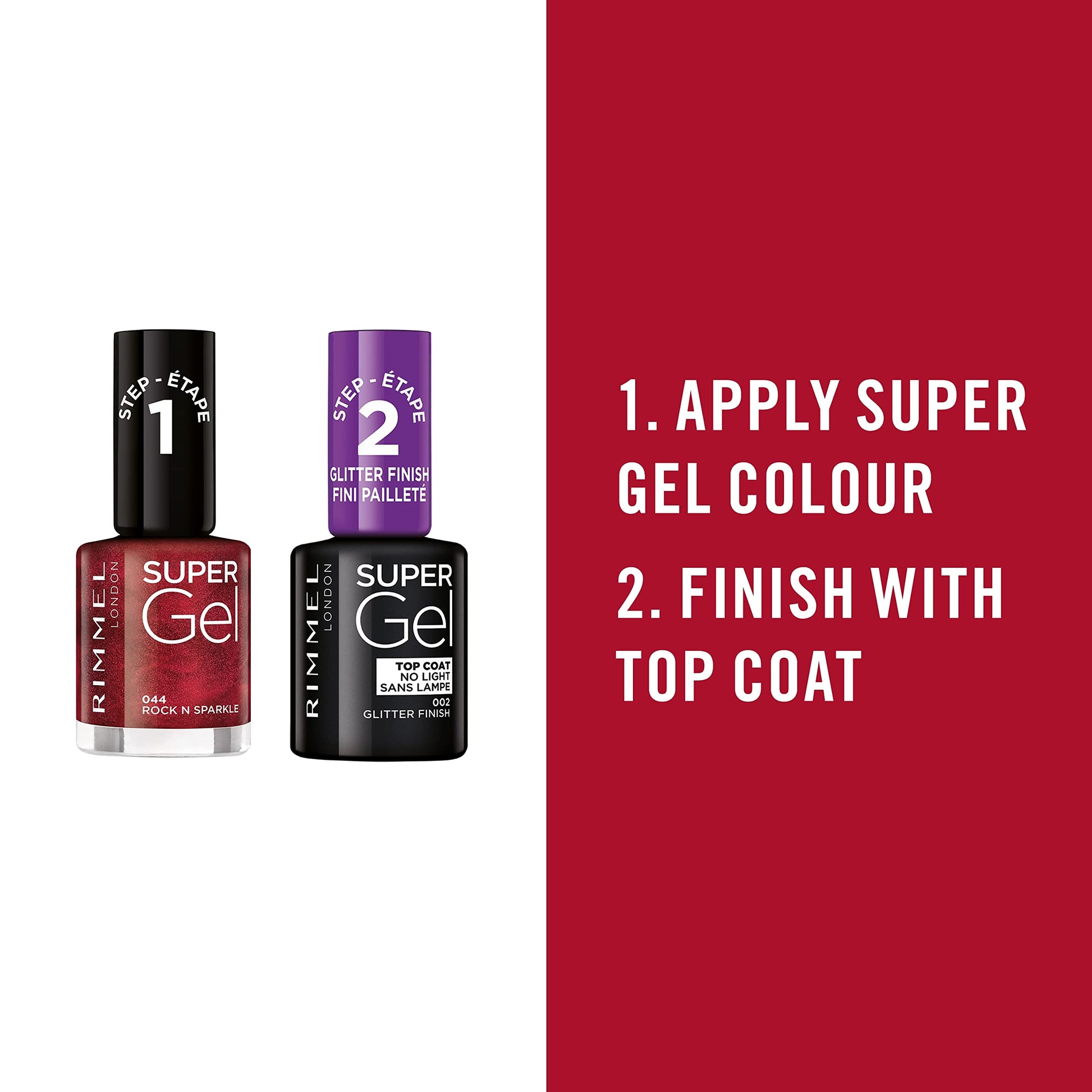 - Apply 2 coats of Super Gel colour, followed by the Super Gel Top Coat for a perfect finish.
